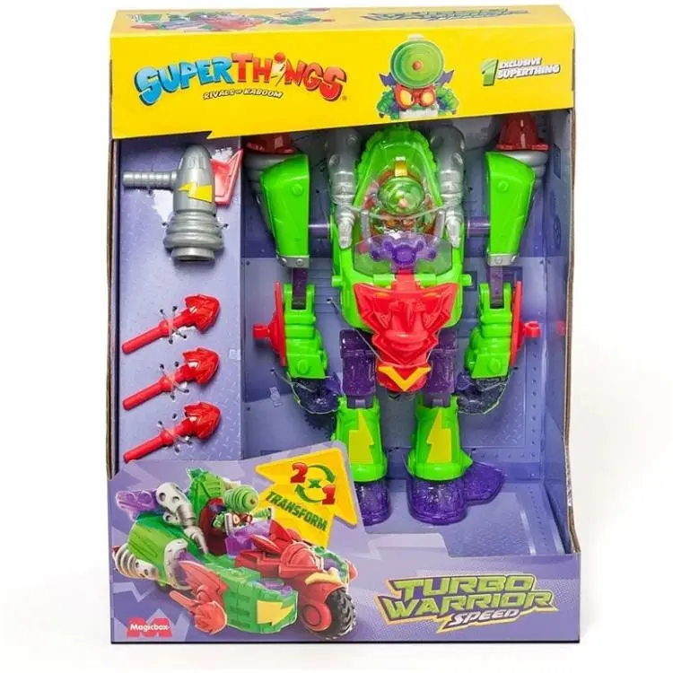 Ласкаво просимо в місто Кабум! Це місце, де живуть і б'ються герої та лиходії — СуперСингс. У кожного є суперздібності, які вони завжди готові застосувати. Не втрачайте пильність, адже у місті з’явився невловний лиходій — Супербот Трансформер Швидкість! Він може перетворюватися на супермотоцикл і безупинно мчати вулицями міста. Лиходій вже готовий до бою зі своїм супротивником Суперботом Трансформером Силою. Хто ж переможе у запеклому протистоянні? Ультрапушка: заряджайте снарядами пушку, приціляйтеся, натискайте на кнопку і БАМ! Снаряди миттєво полетять у ціль. Трансформуйте робота у супермотоцикл за три етапи! Завдяки двом рухомим колесам супермотоцикл можна рухати по поверхні. Напівпрозорі деталі додають іграшці максимально крутого вигляду! Керуйте роботом-трансформером за допомогою фігурки СуперСинг або свого улюбленого казум-кід, щоб він розумно використовував свою зброю і брав участь у битвах із суперниками. Зберіть всю колекцію супергероїв та суперлиходіїв! У наборі: 1 робот-трансформер 1 фігурка 1 іграшкова зброя 3 іграшкових снаряди. Рекомендовано для дітей віком від 3 років.