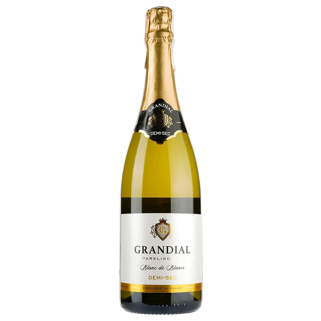 Ігристе вино Les Grands Chais de France Grandial, Blanc de Blancs, біле, напівсухе - це елегантне та легке вино з блідо-жовтим кольором, що тішить око живим потоком бульбашок. Аромат відкривається приємним букетом, де переплітаються ноти стиглих білих та жовтих фруктів, з легкими квітковими нюансами та делікатними вершковими відтінками. Смак жвавий, збалансований і фруктовий, з освіжаючою кислинкою. Посмак - приємний, з кремовими та фруктовими акцентами.