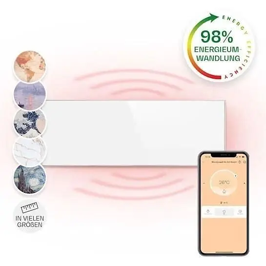 Інфрачервоний обігрівач Wonderwall революціонізує опалення за допомогою сучасних технологій. Надзвичайно плоска, непомітна нагрівальна панель може бути повісена прямо на стіну, і таким чином вона виконує свою функцію зігрівання, надзвичайно економлячи простір. Завдяки IR ComfortHeat він використовує принцип сонячного тепла: замість того, щоб повільно нагрівати повітря, він випромінює приємні інфрачервоні теплові промені, які безпосередньо нагрівають людей і предмети цілеспрямовано. Ваш новий електричний обігрівач є надзвичайно енергоефективним: 95% споживаної електроенергії перетворюється на теплові промені, при цьому ні пил, ні шум не утворюються.