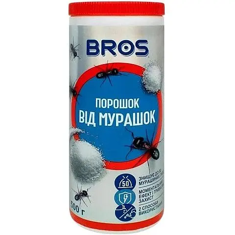 Інсектицид Проти мурашок Bros - це порошок для боротьби з мурахами в приміщеннях і в їхній безпосередній близькості: на терасах, під'їзних дорогах, доріжках, в альтанках тощо. Дуже ефективний завдяки використанню двох різних типів приманок цукрової та білкової. Цей склад мурахи дуже охоче з'їдають препарат і переносять його у свої гнізда.