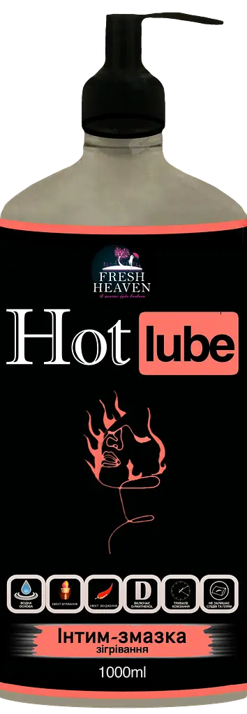 Інтим-змазка (лубрикант) "Hot Lube" ТМ "Fresh Heaven", базується на водній основі, для вагінального застосування із ефектом зігрівання та додаткового стимулювання статевих органів. Засіб прозорий на вигляд та підходить для всіх типів шкіри. Має нейтральний смак, аромат та лагідний рівень pH. Унікальна рецептура продукту розроблена в лабараторії Німеччини, що гарантує високу якість готової продукції.