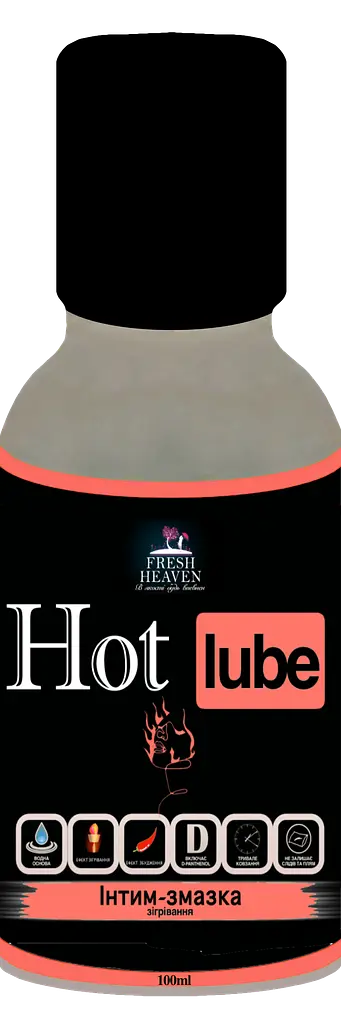 Інтим-змазка (лубрикант) "Hot Lube" ТМ "Fresh Heaven", базується на водній основі, для вагінального застосування із ефектом зігрівання та додаткового стимулювання статевих органів. Засіб прозорий на вигляд та підходить для всіх типів шкіри. Має нейтральний смак, аромат та лагідний рівень pH. Унікальна рецептура продукту розроблена в лабараторії Німеччини, що гарантує високу якість готової продукції.