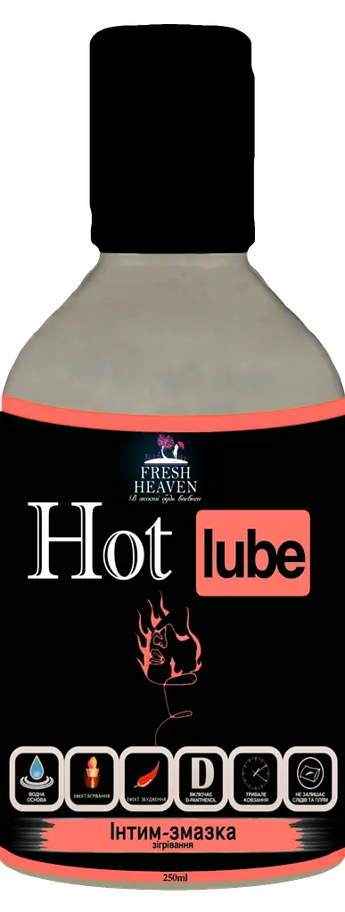 Інтим-змазка (лубрикант) "Hot Lube" ТМ "Fresh Heaven", базується на водній основі, для вагінального застосування із ефектом зігрівання та додаткового стимулювання статевих органів. Засіб прозорий на вигляд та підходить для всіх типів шкіри. Має нейтральний смак, аромат та лагідний рівень pH. Унікальна рецептура продукту розроблена в лабараторії Німеччини, що гарантує високу якість готової продукції.