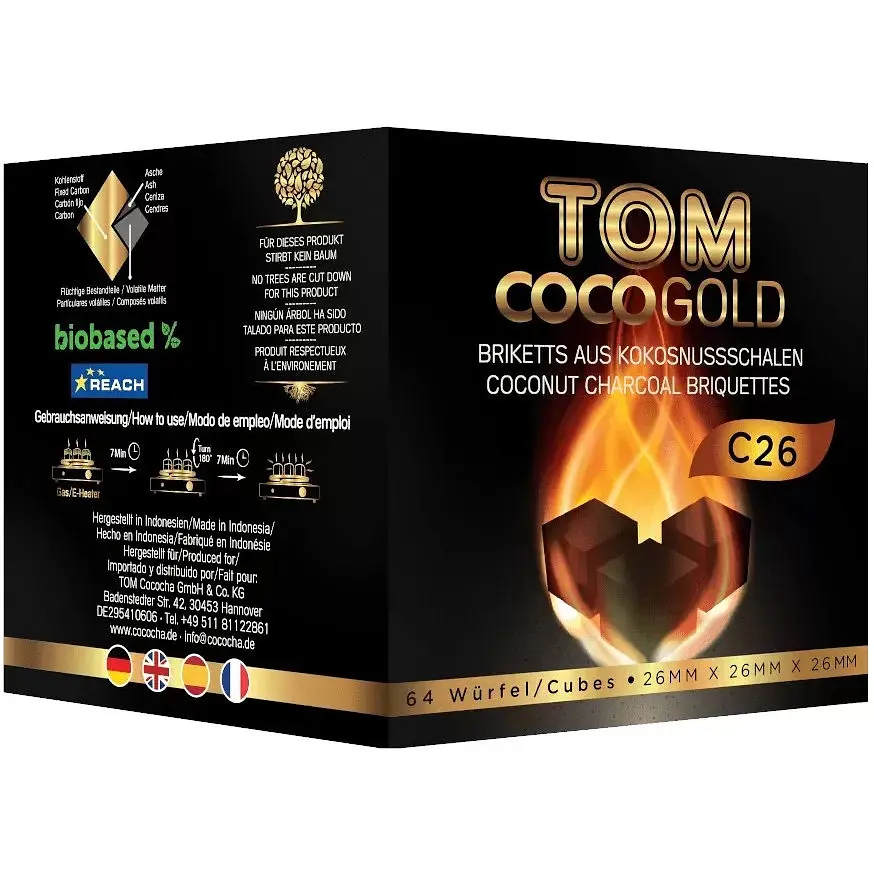 Кокосове вугілля для кальяну Tom COCO (Cococha) Gold 1кг C26 – кокосове вугілля німецької компанії Tom Coco, виготовлене в Індонезії. При використанні немає стороннього запаху, швидко розпалюється і впевнено тримає температуру до 50-60 хвилин. Світлий попіл говорить про натуральність продукту, що легко збивається. В упаковці 64 кубики розміром 26х26х26мм. Використовуючи Калауд для комфортного використання достатньо 2-3 кубики даного розміру.