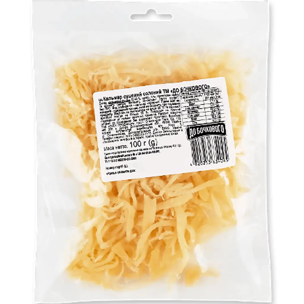 Кальмар сушений солоний До Бочкового 100 г - це популярний продукт, який часто використовується як закуска або інгредієнт для різних страв. Він отримується шляхом сушіння та соління м'яса кальмара для надання інтенсивного морського смаку.