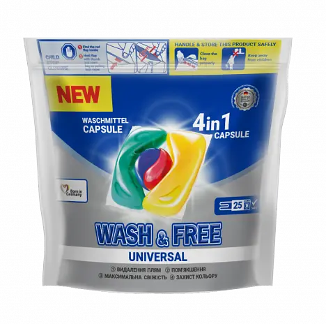 Капсули для прання Wash&Free (Вош&Фрі) забезпечать чудове видалення плям та чистоту речей з першого прання.