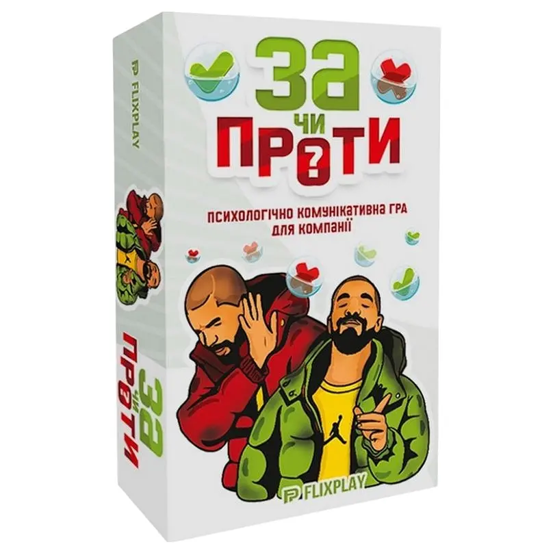 "За чи Проти?" - це комунікабельна настільна гра психологічного характеру. Граючи з друзями ви не просто весело проведете час, а ще відкриєте їх з іншої сторони, потренуєте ораторськи навички та акторську майстерність.