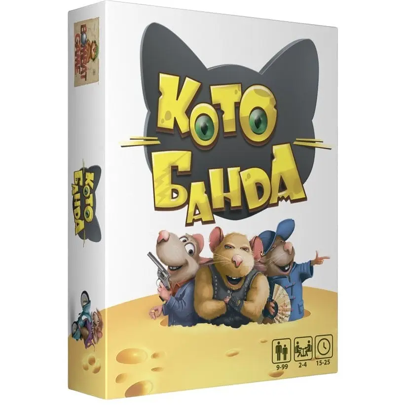 Чотири банди гризунів, наввипередки намагаються зібрати якомога більше добірних шматочків. Однак, не тільки миші полюють за сиром, а також і кіт не проти поласувати смаколиками. Тому гравцям доведеться сконцентрувати увагу і цілком задіяти свою кмітливість, щоб вірно розрахувати комбінацію карт, ввести в оману суперників і не зустріти кота! "Котобанда" - це швидка карткова гра на збір сетів (комбінацій карт) для 2 - 4 гравців. Зберіть з карт на руках свою мишачу банду по будь-якою ознакою (національність миші, її прикмети або предмети), щоб вкрасти шматочок сиру у кота чи іншої банди! Збирайте карти швидше, але не дивіться, що мишки такі милі - разом вони стають справжньою бандою, точніше "котобандой", який має можливість протистояти коту! Виграє той, хто збере більше шматочків сиру. Так хто, врешті-решт, захопить сир, а хто "залишиться з носом"? ЩО В КОРОБЦІ: - 24 карти (16 карт мишей, 4 карти сиру, 4 карти котів) - Кружечок сиру (з 12-ти шматочків) - Фішка першого гравця і правила ЯК ГРАТИ? Гра освоюється за лічені секунди. Всім лунає по 4 карти, ще 4 карти викладається на стіл. У свій хід гравець може: помінятися картою зі столом, або помінятися з колодою, або зіграти пастку на суперника. Виграє раунд той, хто першим набере сет з чотирьох карт бандитів одного типу. І це тільки один шматочок сиру! У грі перемагає володар найбільшої кількості сирних делікатесів.