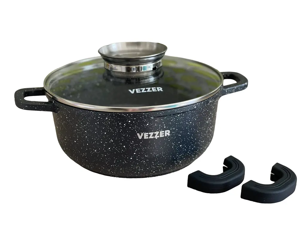Каструля Vezzer - це надійний кухонний посуд, виготовлений із високоякісного литого алюмінію з антипригарним мармуровим покриттям, що забезпечує довговічність і комфорт у використанні.