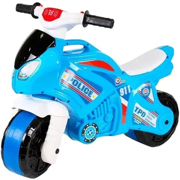Дизайн і конструкція виробу максимально продумані, ергономічні та сучасні. Байк біло-блакитного кольору з яскравими "поліцейськими" наклейками має широкі, надійні колеса зі вставкою і зручний кермо. Завдяки оптимальній ширині керма і ручок з м'якого, еластичного матеріалу, дитині легко керувати мотоциклом як на вулиці, так і в приміщенні. Крім того, на мотоциклі є спеціальна ручка для комфортного транспортування мотоцикла.
