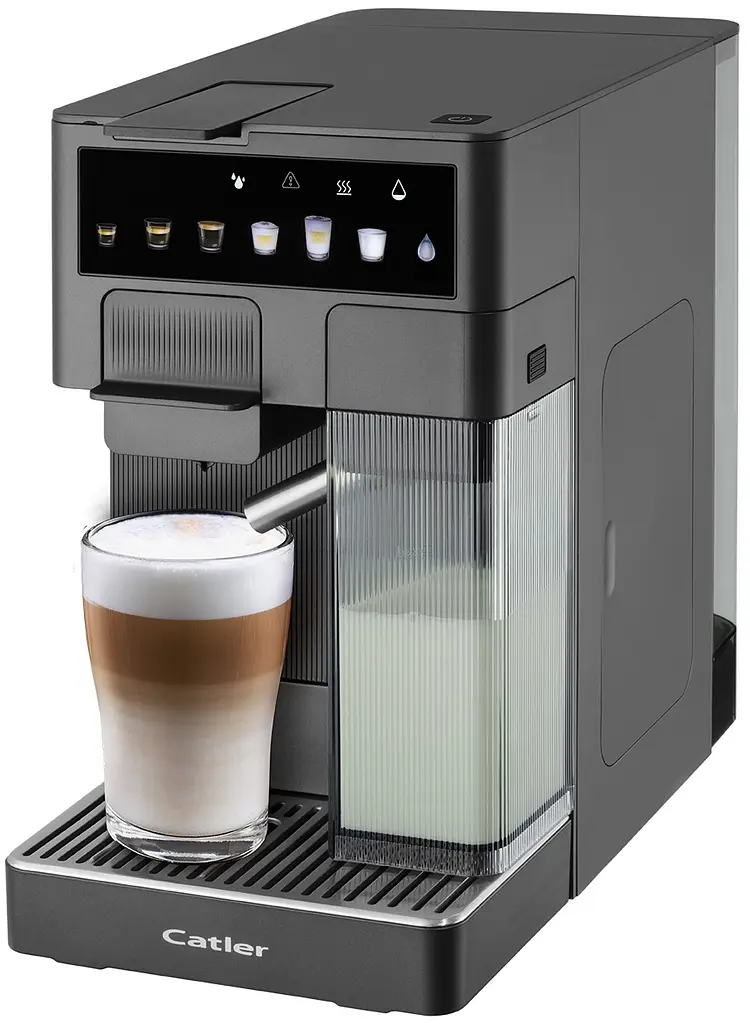Catler ES 750 G Renzo — автоматична еспресо-кавомашина з підтримкою капсул і меленої кави. Тиск помпи 20 бар, знімний бак для води 1,6 л, кольоровий сенсорний дисплей і три розміри чашки для швидкого вибору подачі. У комплекті 3 адаптери під найпоширеніші капсульні формати та адаптер для меленої кави, передбачено контейнер для молока та спінювач.