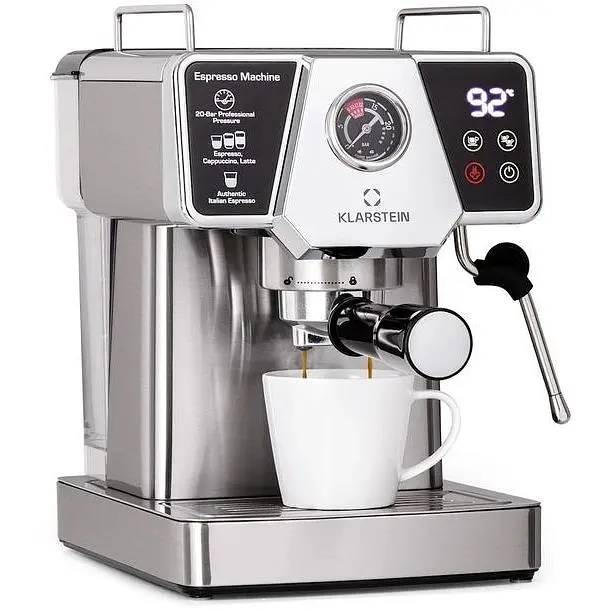 Для насолоди високоякісною кавою: Klarstein Libeica - це елегантна еспресо-машина в привабливому дизайні з нержавіючої сталі з дисплеєм температури та тиску. Завдяки потужній потужності 1350 Вт і тиску 19 бар він витягує найкращий аромат кави з усіх зерен. Завдяки класичному портафільтру з нержавіючої сталі можна використовувати як каву, так і порошок еспресо. За допомогою парової насадки ви можете швидко створити кремову піну для капучіно або латте макіато. Завдяки значному об’єму, одного заповнення знімного резервуара для води вистачає приблизно на 10 чашок кави.