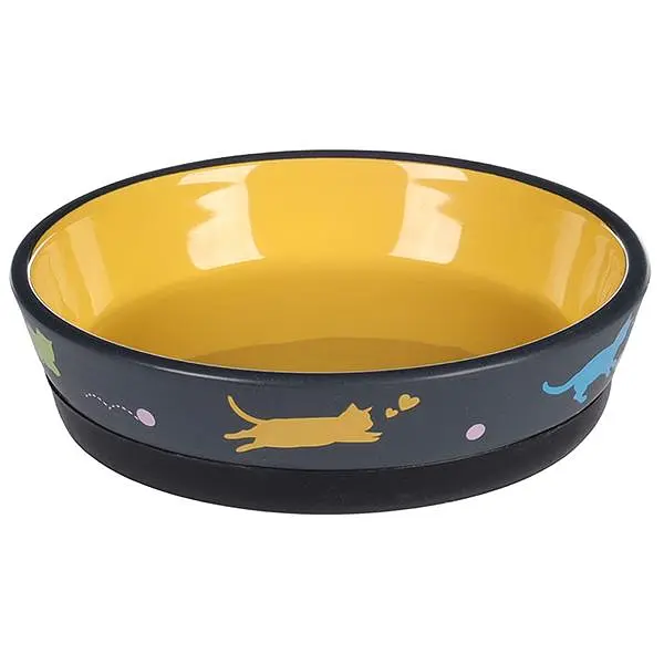 Керамічна миска для котів Flamingo Rani Antislip - це зручний та стильний посуд для вашого улюбленця, який ідеально підходить для будь-яких видів корму або для води. Її місткість становить 320 мл, що є оптимальним для однієї порції. Стильний дизайн із зображеннями котів та яскрава жовта внутрішня поверхня створюють привабливий вигляд, який прикрасить місце годування вашого улюбленця. Миска оснащена знімним гумовим нековзним кільцем на дні, яке гарантує її стійкість навіть на гладких поверхнях.