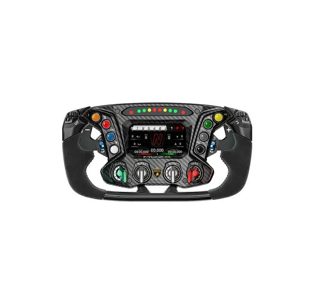 Офіційна репліка керма від гіперспортивного Lamborghini Essenza SCV12, виготовлена лише в 40 екземплярах2. Передня панель виготовлена з 3D-вуглецевого волокна, рама — з алюмінієвого сплаву, обробленого на верстаті з ЧПК. Ергономічні ручки з натуральної замші забезпечують комфорт і надійний хват. Він оснащений 4,3-дюймовим сенсорним РК-дисплеєм з налаштованим інтерфейсом користувача та можливостями телеметрії. Оснащений чотириядерним процесором з тактовою частотою 1,3 ГГц для плавного відображення даних. Він пропонує до 72 програмованих входів, включаючи кнопки, поворотні перемикачі та селектори. Світлодіодний індикатор передачі з RGB-ефектами покращує візуальні враження від водіння. Сумісний з усіма базами MOZA та, через MOZA Hub, з іншими системами.