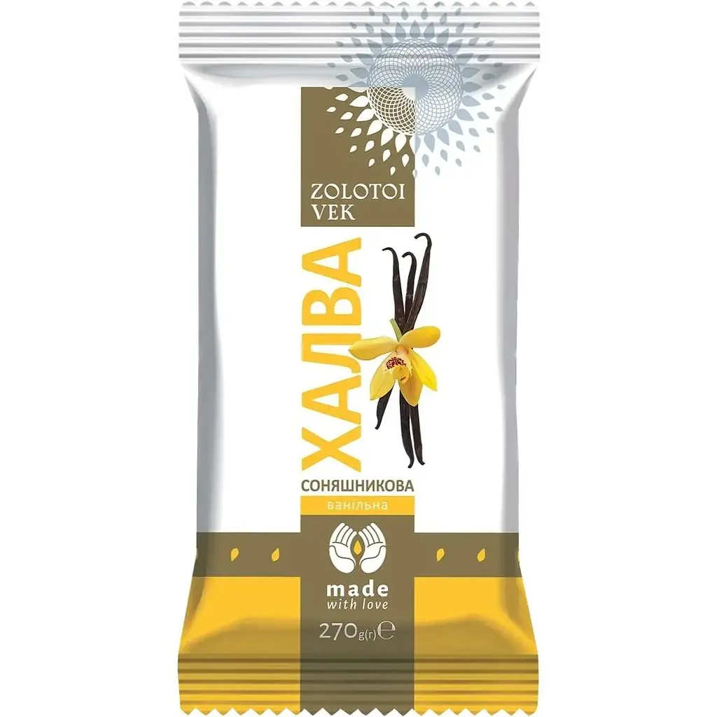 Халва Zolotoi Vek соняшникова ванільна порадує класичним смаком халви з додаванням витонченої нотки ванілі. Халва виготовлена з обсмаженого ядра соняшнику, цукру, патоки, кореня колючелистника та ваніліну.