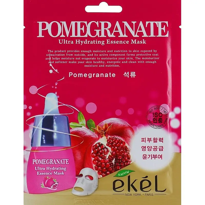 Маска тканинна Ekel з екстрактом гранату містить велику кількість вітамінів і мінералів, які живлять шкіру та надають їй ефект сяйва. Екстракт гранату, багатий на фітоестрогени, кальцій та залізо, стимулює синтез колагену, покращує мікроциркуляцію шкіри, має виражену антиоксидантну дію, зволожує, пом'якшує і розгладжує шкіру, запобігаючи передчасному старінню. Особливо екстракт гранату ефективний для чутливої та сухої шкіри завдяки своїй властивості поновлювати гідпроліпідний бар’єр.