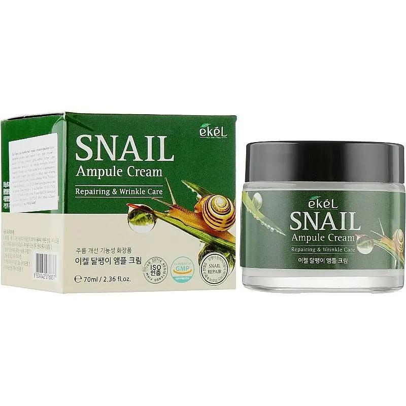 Ампульний крем для обличчя з муцином равлика Ekel - це висококонцентрований коктейль з натуральних компонентів, який уповільнює процеси старіння, бореться з дрібними недосконалостями і слідами втоми. Завдяки гіалуроновій кислоті і екстракту плаценти засіб активізує синтез «білків молодості» (колагену й еластину), який після 25 років поступово йде на спад і призводить до втрати пружності.