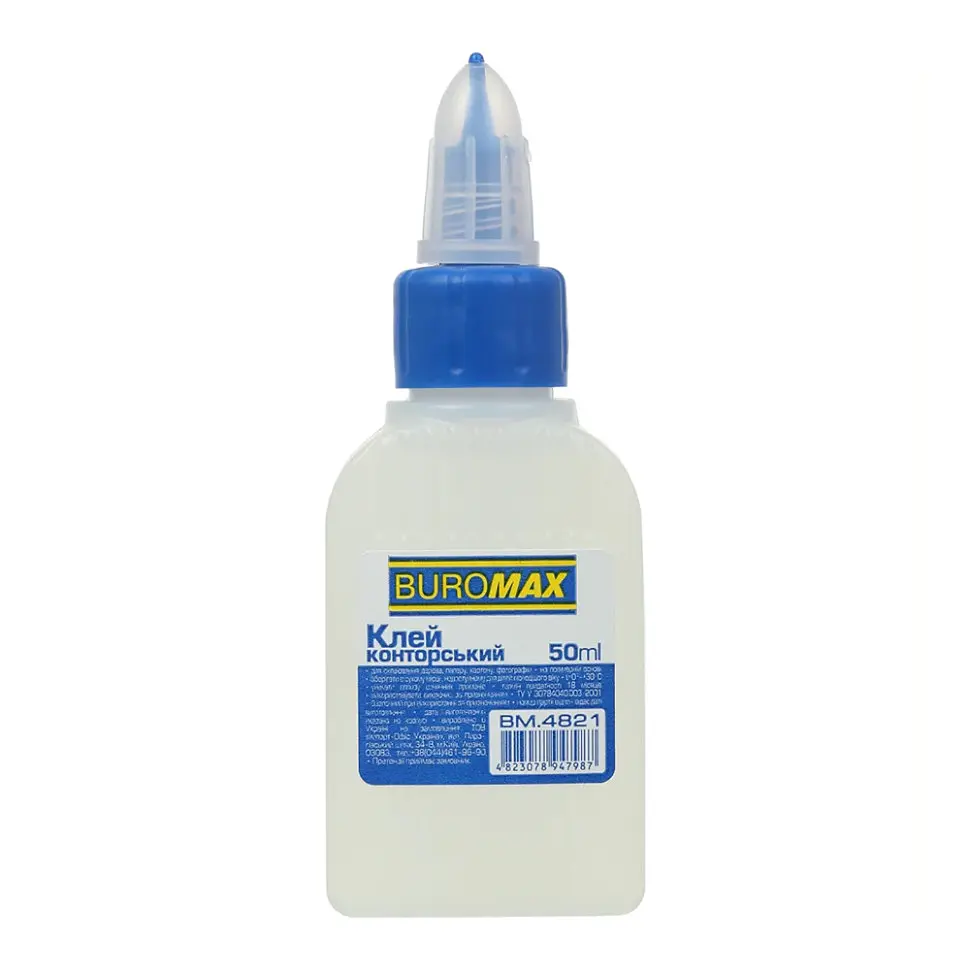 Клей канцелярський BUROMAX - стане незамінним помічником у роботі. Підходить для щоденного використання в офісі, а також для творчості. Характеристики: об'єм - 50 мл для склеювання паперу, картону, фотографій, тканини пластиковий флакон з дозатором, який викручується ковпачок-дозатор регулює подачу клею та запобігає висиханню клей наноситься тонкою лінією на полімерній основі BUROMAX - це якість і надійність!