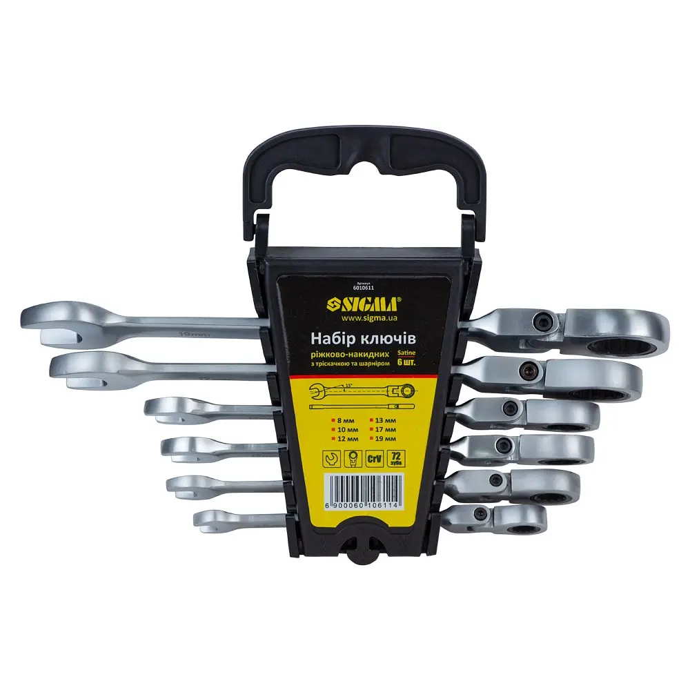 Набір ключів з тріскачкою короткого типу виготовлений з хромованадіевой стали. З одного боку ключа - стандартний ріжковий профіль, з протилежного - накидний (дванадцятигранний динамічний профіль) з вбудованою тріскачкою (72 зуба) і поворотною конструкцією шарнірної тріскачки на 180°. Дана конструкція дозволяє використовувати ключі в важкодоступних місцях.