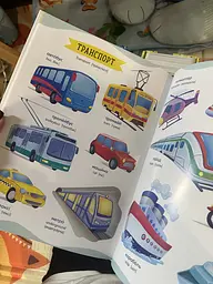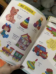 Дуже яскрава й цікава книга для раннього розвитку. Багато ілюстрацій, великі чіткі картинки, які легко показувати й називати разом із дитиною. Теми різноманітні — від тварин і побуту до транспорту та природи. Міцні сторінки, витримують активне гортання.