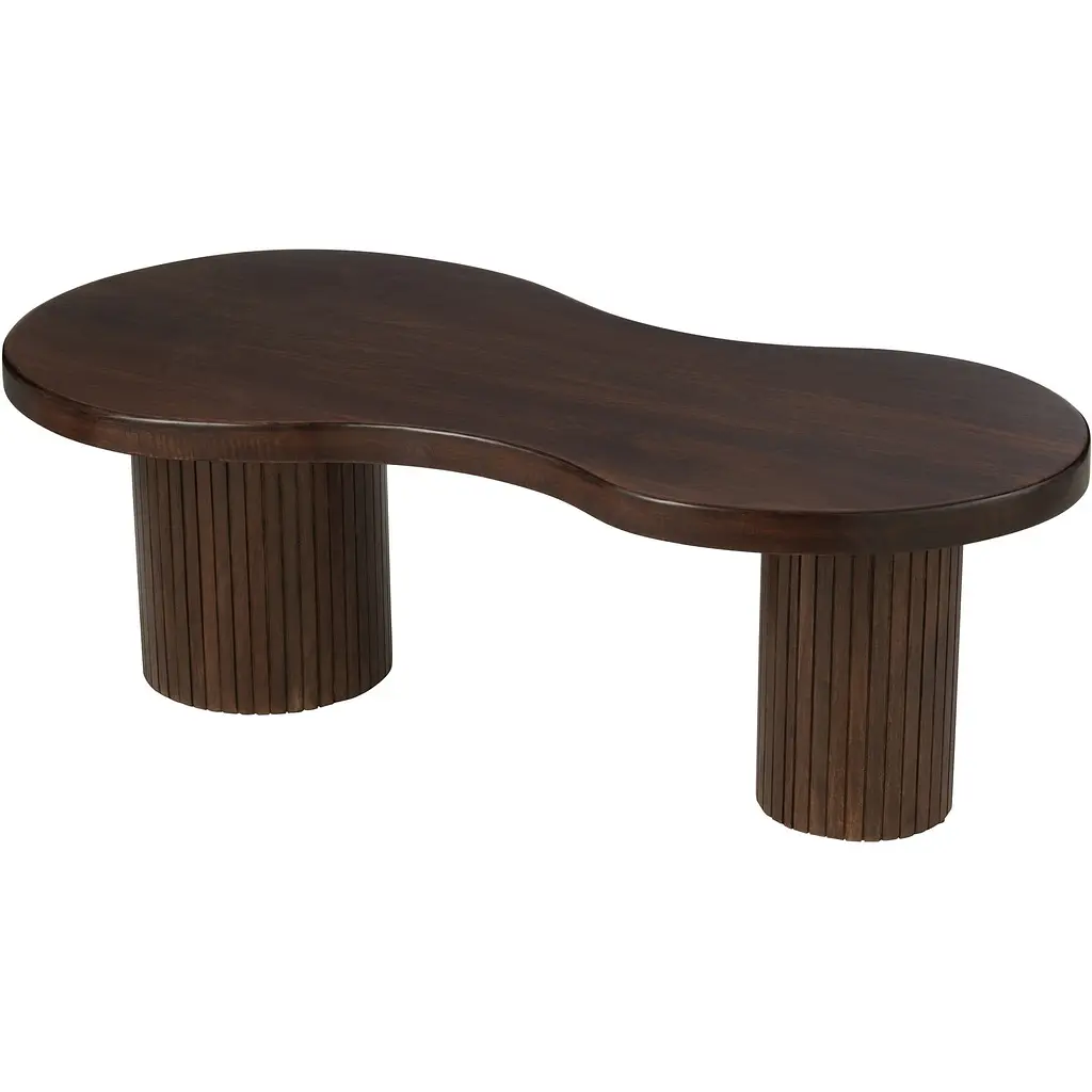 Цей кавовий столик має сучасний органічний стиль з елементами ретро та модерну. Характерною особливістю є плавна форма стільниці, що нагадує абстрактні або природні обриси, та ребристі циліндричні ніжки, що додають текстури та акценту. Сучасний дизайн додає естетичної привабливості інтер'єру.
