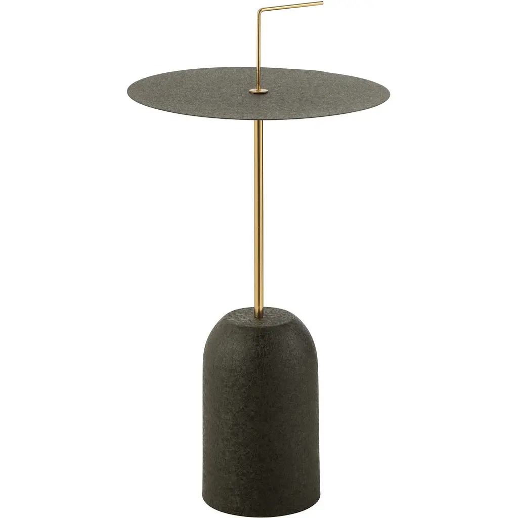 Цей столик виконаний у сучасному мінімалістичному стилі з елементами скандинавського та індустріального дизайну. Прості форми без зайвих деталей. Чітка геометрія та відсутність орнаментів або додаткових елементів роблять цей столик дуже лаконічним. Металеві елементи, зокрема тонка ніжка золотого кольору, додають індустріальної естетики та відчуття сучасності. : База столика має матову, темну поверхню, яка гармонійно контрастує з гладким блиском металевої ніжки, створюючи цікавий візуальний ефект.