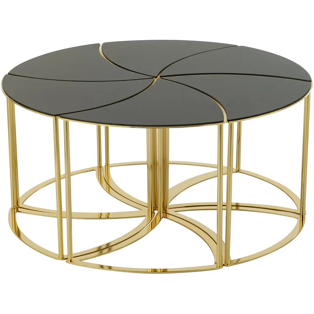 Цей стіл виконаний у стилі сучасного гламурного арт-деко. Характерні риси цього стилю - поєднання чорної скляної поверхні з глянцевими золотистими металевими елементами, що надає меблям елегантності та вишуканості. Закруглені лінії основи та симетричний дизайн також є характерними для сучасного гламурного стилю, додаючи витонченості інтер'єру.