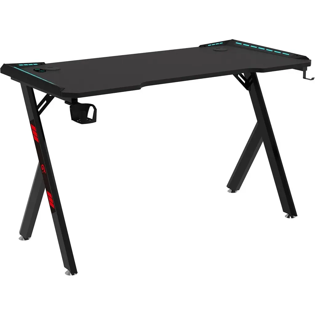 GT Racer T-1242 пропонує просторе робоче місце з розмірами 120 см на 60 см, що дозволяє розмістити все необхідне обладнання. Додаткові функціональні елементи, такі як тримач для навушників та підставка під чашку, допомагають підтримувати порядок на робочому місці. LED-підсвітка по краях столу не лише покращує візуальне сприйняття, а й створює унікальну атмосферу, дозволяючи зосередитися на грі або роботі навіть в умовах слабкого освітлення.