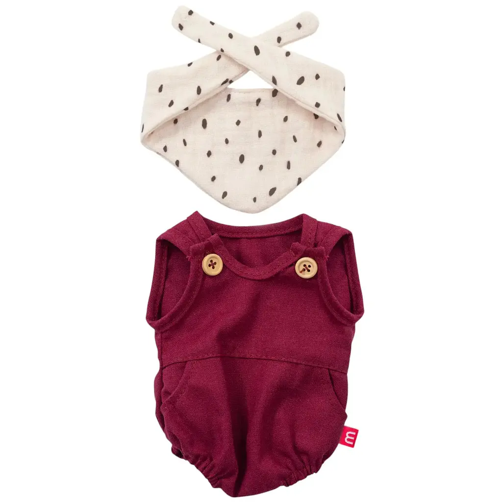 Стильний комплект для ляльки Miniland 38 см складається з боді кольору бордо і слинявчика. Одяг виготовлено з високоякісних текстильних матеріалів безпечних для дітей. Набір можна прати вручну.