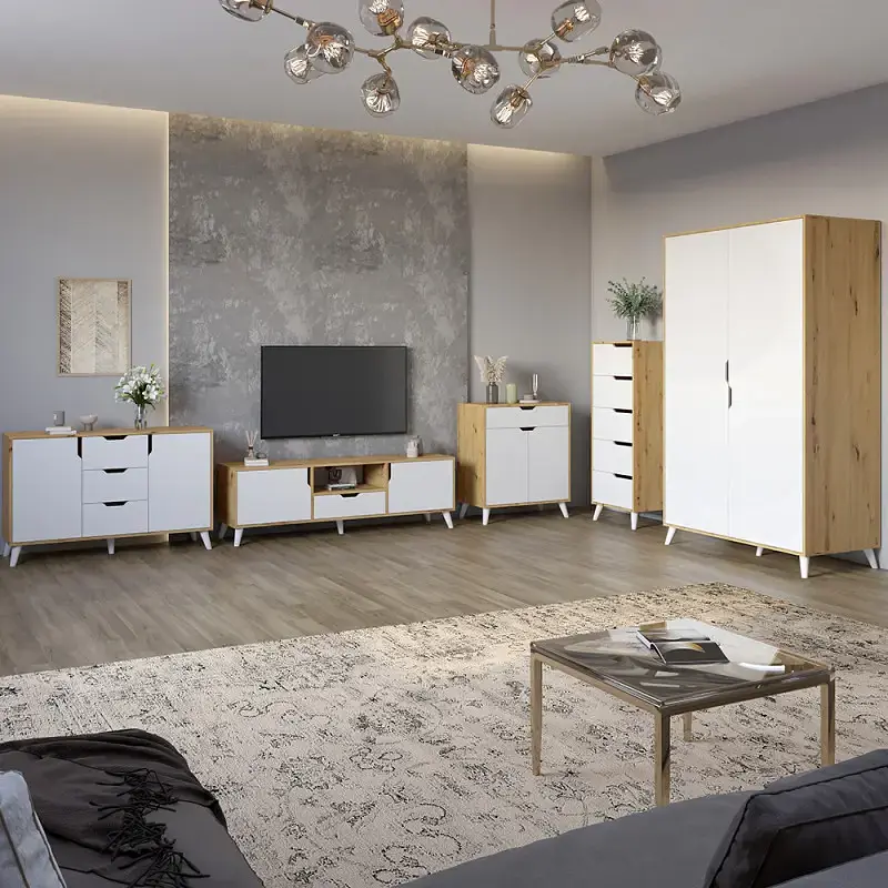 Модульний комплект продуманий для різних завдань зберігання - від одягу і техніки до дрібних аксесуарів. Ідеально підходить для віталень, спалень або сучасних студійних просторів.