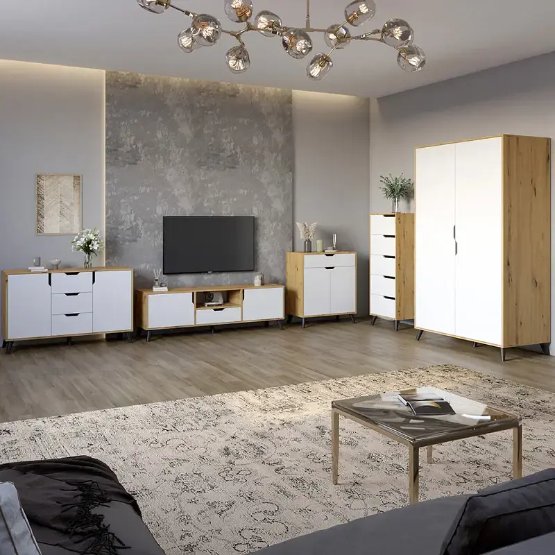 Комплект меблів для вітальні М-ЗОН Борн виконаний у сучасному мінімалістичному стилі та поєднує функціональність і естетичну простоту. Міцні матеріали та стійкі чорні ніжки забезпечують надійність і довговічність меблів. До складу комплекту входять комод Борн 500, комод Борн 750, комод Борн 1200, тумба ТВ Борн, шафа Борн 1200.