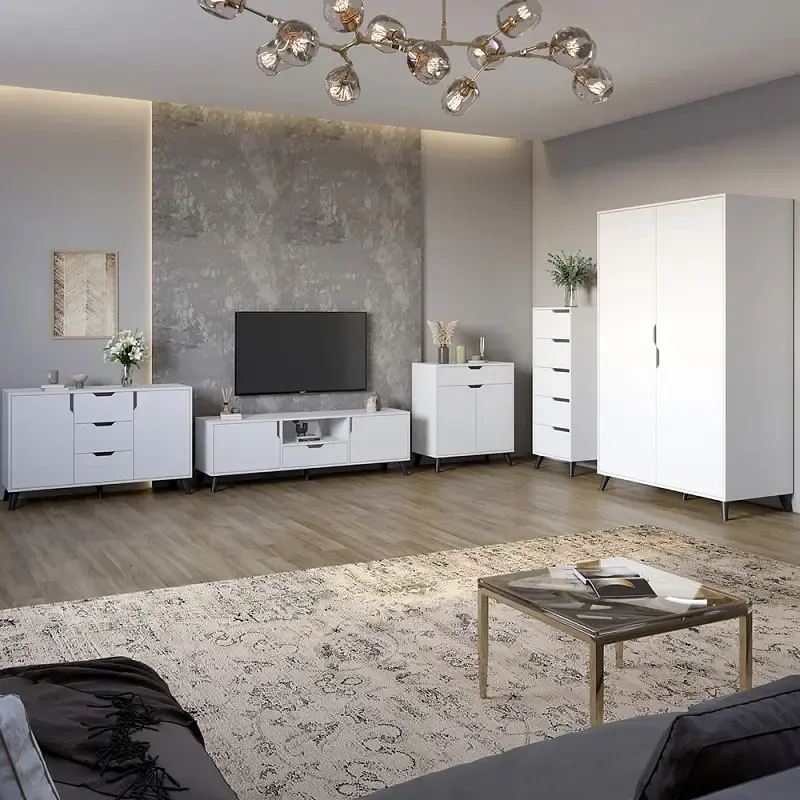 Комплект меблів для вітальні М-ЗОН Борн виконаний у сучасному мінімалістичному стилі та поєднує функціональність і естетичну простоту. Міцні матеріали та стійкі чорні ніжки забезпечують надійність і довговічність меблів. До складу комплекту входять комод Борн 500, комод Борн 750, комод Борн 1200, тумба ТВ Борн, шафа Борн 1200.