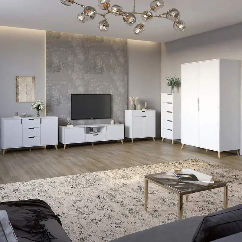 Комплект меблів для вітальні М-ЗОН Борн виконаний у сучасному мінімалістичному стилі та поєднує функціональність і естетичну простоту. Міцні матеріали та стійкі чорні ніжки забезпечують надійність і довговічність меблів. До складу комплекту входять комод Борн 500, комод Борн 750, комод Борн 1200, тумба ТВ Борн, шафа Борн 1200.