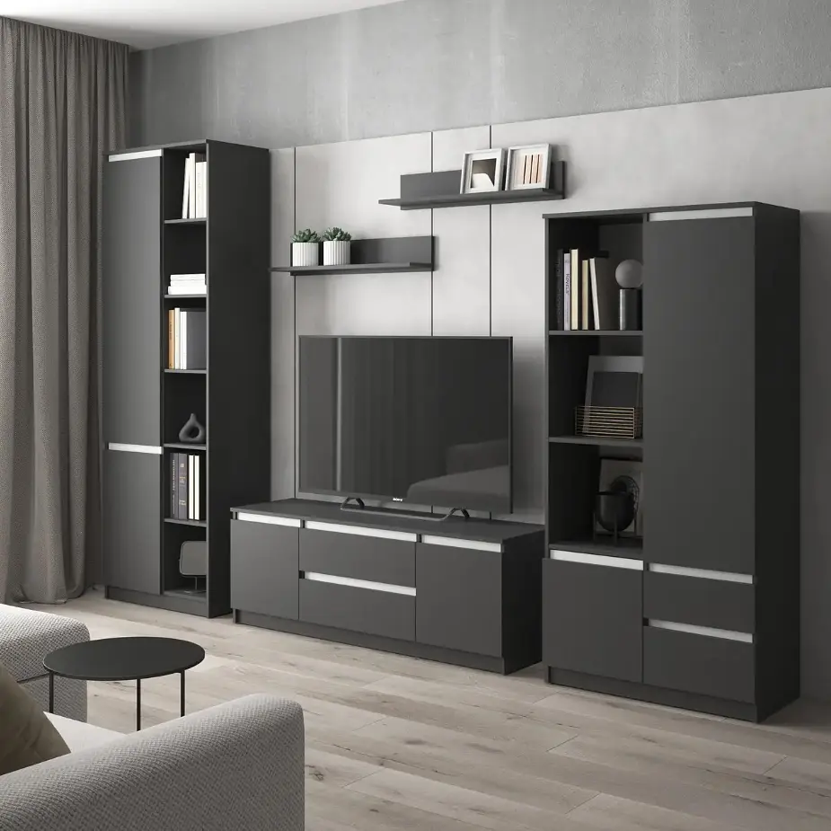 Сучасний стильний комплект меблів з фасадами без ручок складається з шафи R-26, шафи R-27, тумби під телевізор R-28 і з 2-х поличок М-22.