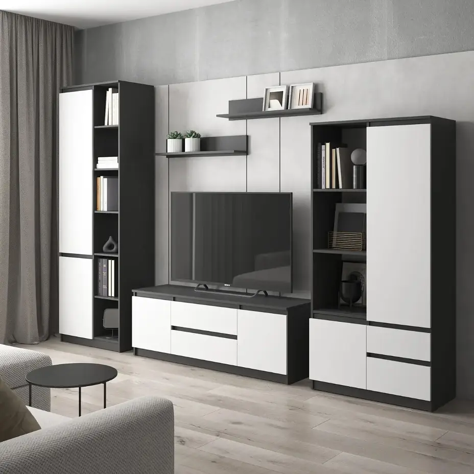Сучасний стильний комплект меблів з фасадами без ручок складається з шафи R-26, шафи R-27, тумби під телевізор R-28 і з 2-х поличок М-22.