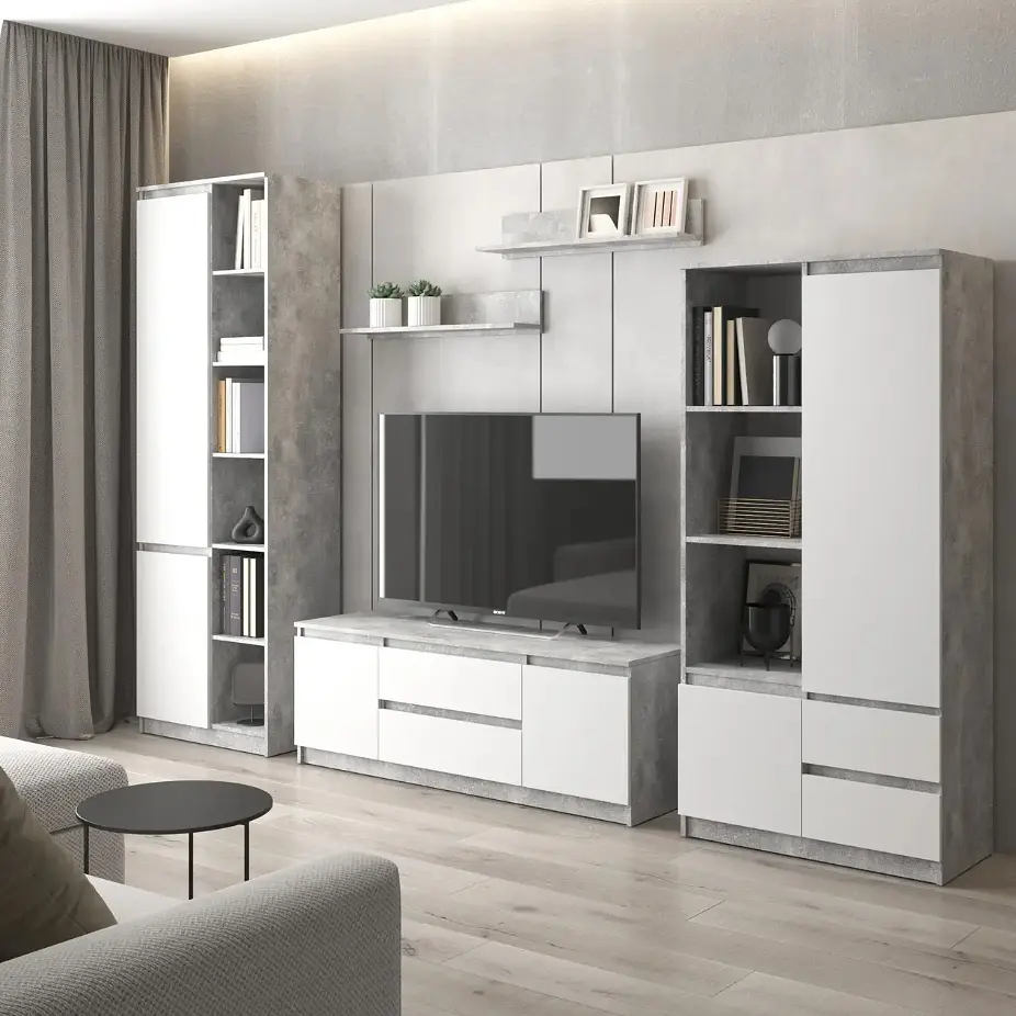 Сучасний стильний комплект меблів з фасадами без ручок складається з шафи R-26, шафи R-27, тумби під телевізор R-28 і з 2-х поличок М-22.
