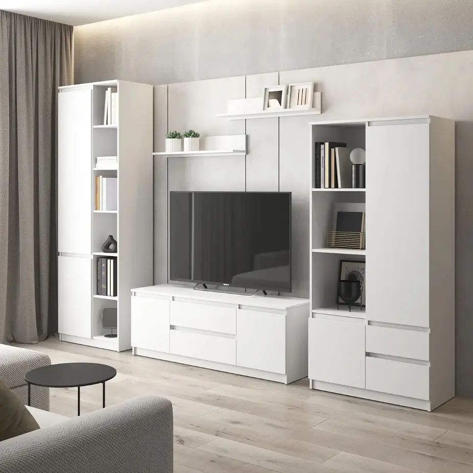 Сучасний стильний комплект меблів з фасадами без ручок складається з шафи R-26, шафи R-27, тумби під телевізор R-28 і з 2-х поличок М-22.