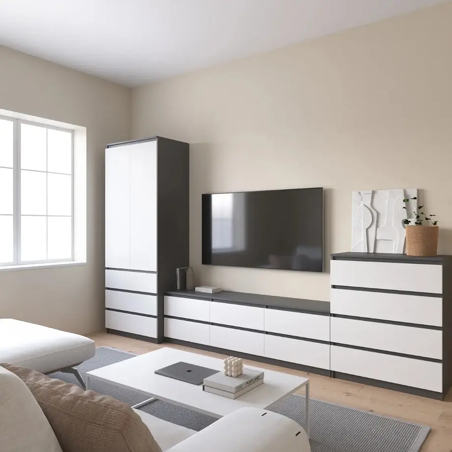 Сучасний стильний комплект меблів із фасадами без ручок складається з шафи R-9, тумби під телевізор R-12, та комода R-4.
