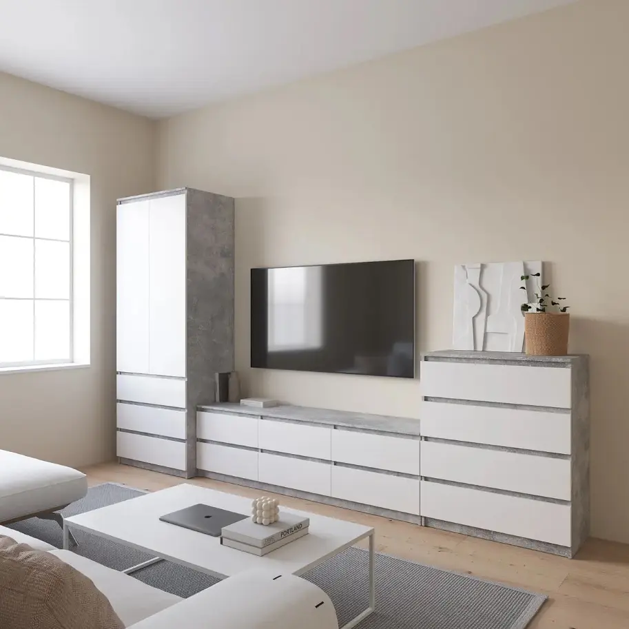 Сучасний стильний комплект меблів із фасадами без ручок складається з шафи R-9, тумби під телевізор R-12, та комода R-4.