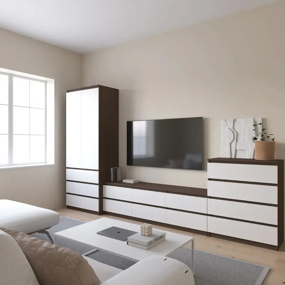 Сучасний стильний комплект меблів із фасадами без ручок складається з шафи R-9, тумби під телевізор R-12, та комода R-4.