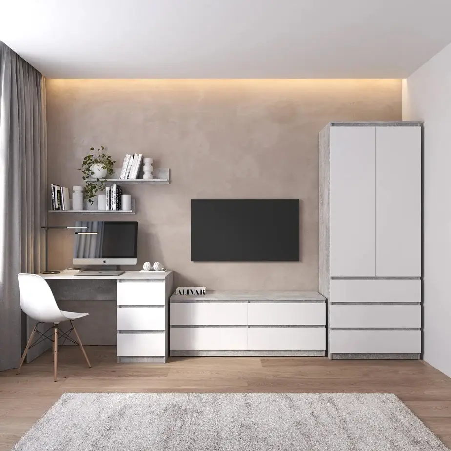 Сучасний стильний комплект меблів із фасадами без ручок складається з шафи R-9, тумби під телевізор R-6, стола R-1 та 2-х поличок M-22.