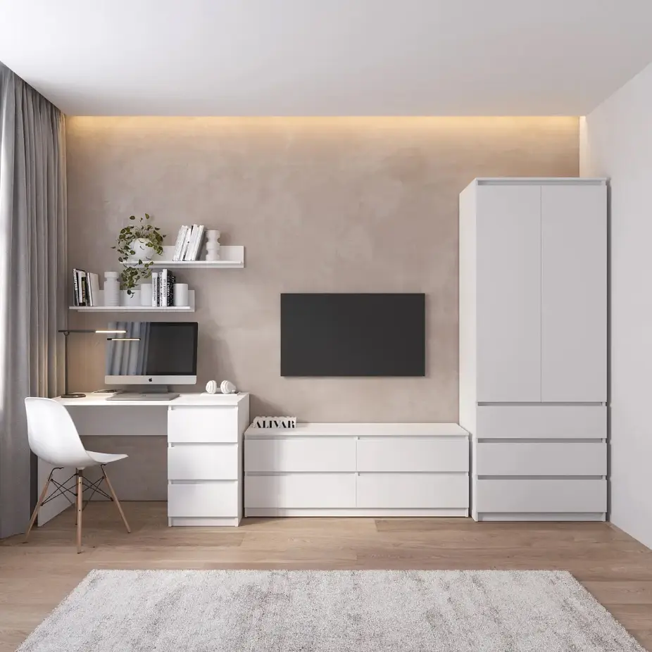 Сучасний стильний комплект меблів із фасадами без ручок складається з шафи R-9, тумби під телевізор R-6, стола R-1 та 2-х поличок M-22.