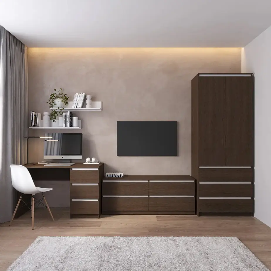 Сучасний стильний комплект меблів із фасадами без ручок складається з шафи R-9, тумби під телевізор R-6, стола R-1 та 2-х поличок M-22.