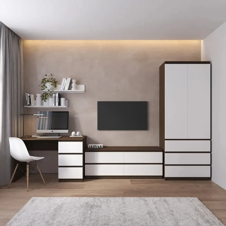 Сучасний стильний комплект меблів із фасадами без ручок складається з шафи R-9, тумби під телевізор R-6, стола R-1 та 2-х поличок M-22.