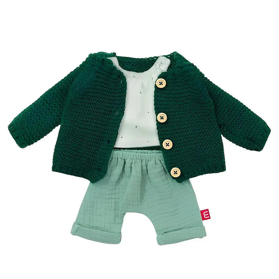 Стильний комплект для ляльки Miniland складається зі штанців, кофти та в'язаної жакетки. Одяг виготовлено з високоякісних текстильних матеріалів безпечних для дітей. Набір можна прати вручну.