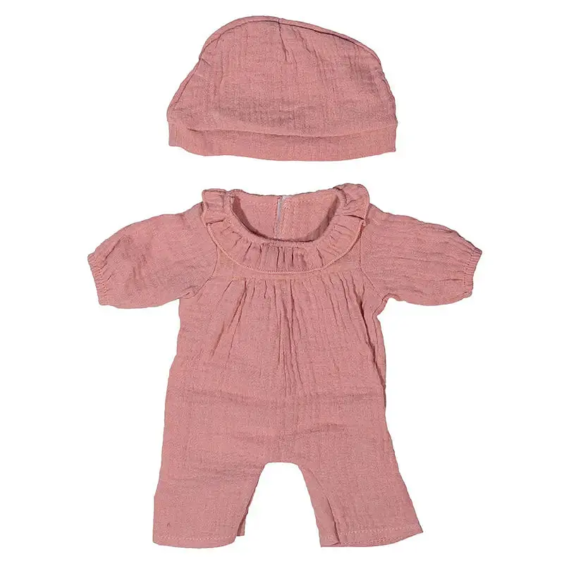 Стильний комплект для ляльки Miniland складається з піжами-чоловічка і шапочки на голову, виготовлених з мусліну. У наборі йде вішалка, тому улюблений комплект не загубиться і не помнеться. До того ж, малюк таким чином вчиться акуратності. Набір одягу можна прати вручну.