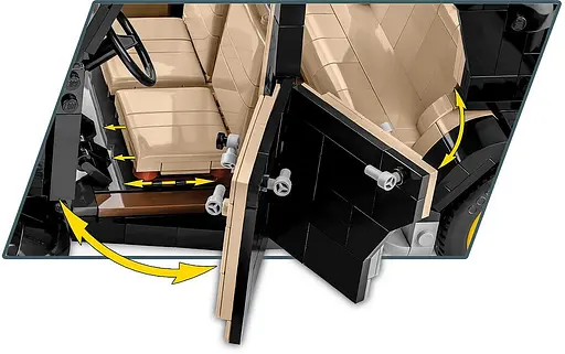 Набір із 1900 елементів - це не тільки машина з рухомими колесами та дверима, що відкриваються, а й робоче кермо та поворотні колеса, відкидний капот, відкривається багажник, відтворений зовнішній вигляд двигуна та численні деталі салону автомобіля, відтворені з блоків.