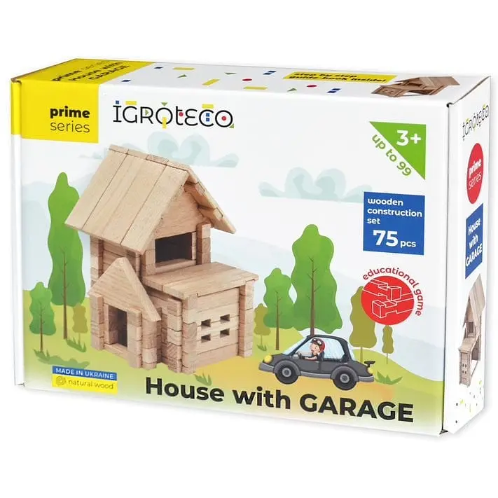 Конструктор "Будиночок з гаражем" призначений для діток від 5-ти років, зібравши виріб по інструкції, дитина отримує компактний двоповерховий дерев'яний будинок з балконом та гаражем для улюбленої машинки. Зібрати його буде легко та цікаво; кожен з етапів зображений у детальній інструкції. Конструктор чудово доповнює ігри з машинками. З'єднання 75 деталей набору - серед яких бруси, півбруси та елементи для побудови дахової конструкції - дасть дитині розуміння основ будівництва помешкань зі зрубу - аутентичному українському методу зведення хат у Карпатах. Бруси та півбруси мають пази для скріплення між собою. Січення брусів - квадратне. Найкоротша деталь - 24 мм. Найдовша - 120 мм. Іграшка виготовлена з твердих порід деревини, не лакована, не фарбована. Іграшка є абсолютно натуральною, екологічною, адже виготовлена з цільної деревини, не містить жодних лако-фарбових покриттів, емульсій, клеїв чи шкідливих домішок. Гра з конструктором розвиває у дитини просторове мислення, логіку, увагу, дрібну моторику та творчі навички. Вміння діяти на базі інструкції, тобто за схемою, поданою у кожному виробі стане гарною базою для швидкого та ефективного навчання у школі. З'єднання деталей не за інструкцією, а за власним бажанням та фантазією, сприятиме розвитку уяви, нестандартного мислення, творчості. Всі вироби ТМ "Ігротеко" поєднуються між собою, тому можна їх колекціонувати. Маючи більше конструкторів ТМ "Ігротеко", дитина зможе побудувати ціле місто з різними видами споруд. Увага. Як і справжні будинки, наші конструктори радимо починати складати з фундаменту. На рівній твердій поверхні викладіть найнижчий рівень, а потім рівень за рівнем, брус за брусом зводьте стіни, перекладайте деталі паз-в-паз, кріпіть їх, робіть перемички, з’єднуйте прибудови і накривайте дахом. Все як у справжньому житті.