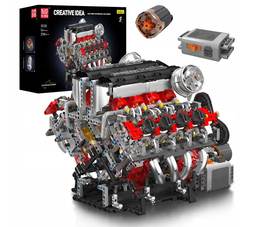 Конструктор двигун складається з понад 2700 елементів. Збираючи конструктор, дитина відчує себе справжнім механіком, встановлюючи 8 обертових поршнів, клапанний механізм, ланцюги газорозподілу, турбіну та випускний колектор.