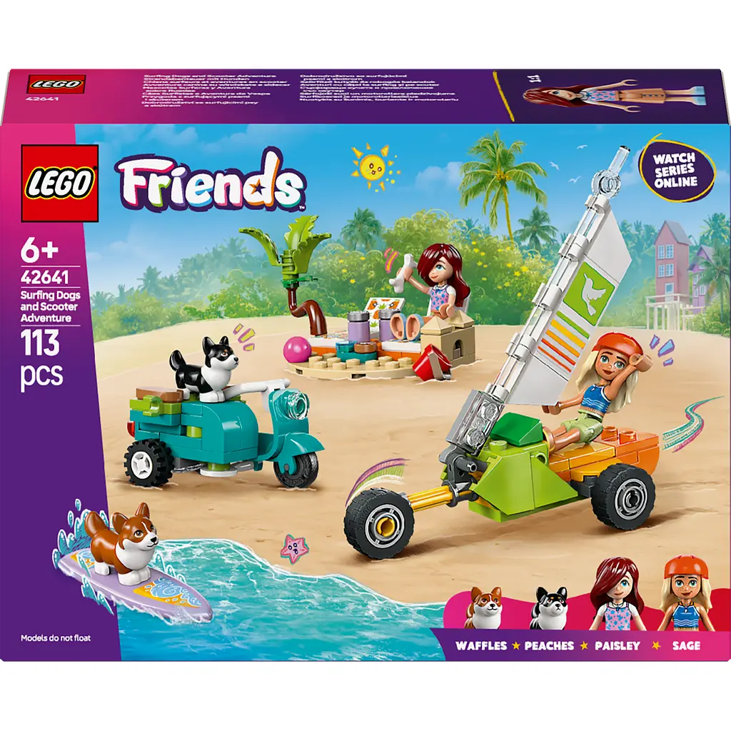 Надихайте дітей створювати власні пляжні пригоди за допомогою набору LEGO® Friends Собачі пригоди на серфі та скутері.